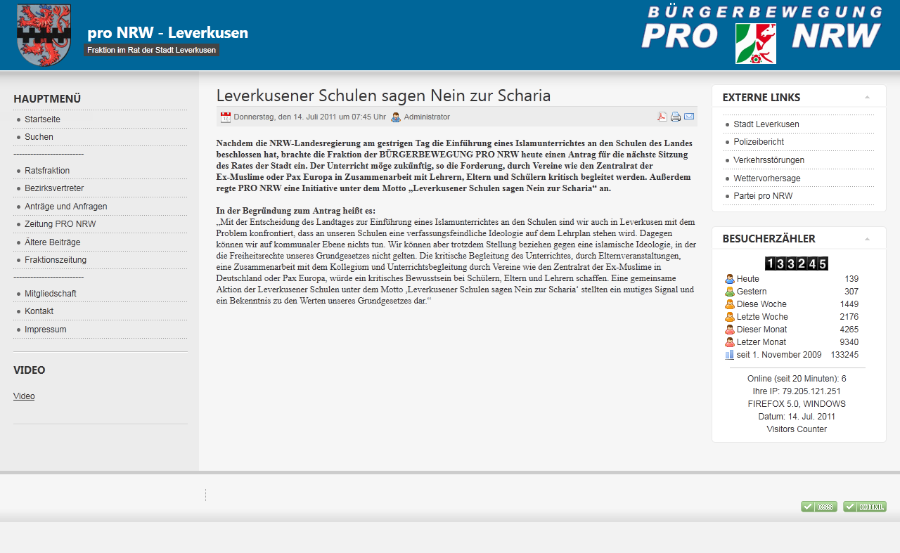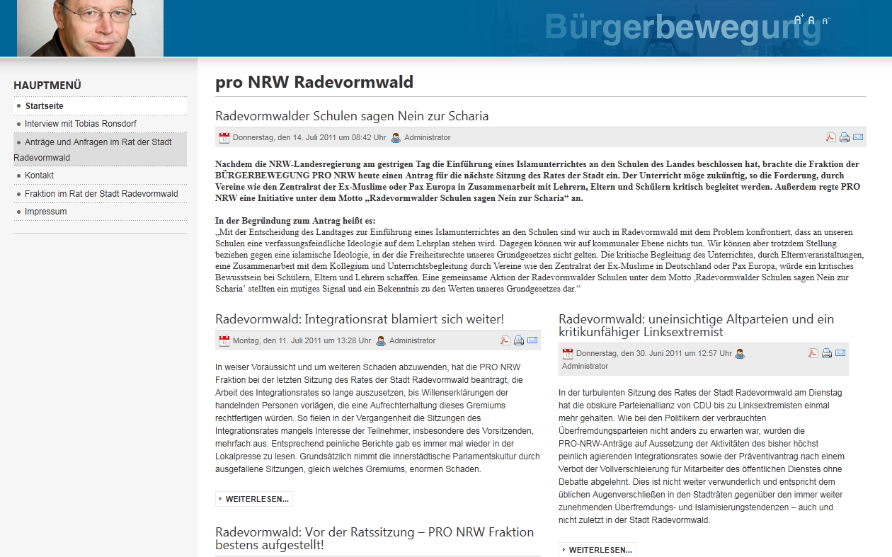 Jetzt hat „pro NRW“ ein ganz aktuelles Thema. Nach der Entscheidung zur Einführung des Islamunterrichts wittert „pro NRW“ verfassungsfeindliche Entwicklungen in Nordrhein-Westfalens Schulen. Zeitnah ist ein entsprechender Artikel mit vermeintlich kommunalpolitischem Bezug erschienen (Hier klicken). Genau wie in Leverkusen (Dort klicken). Ganz genau so. Wieder mal abgeschrieben.